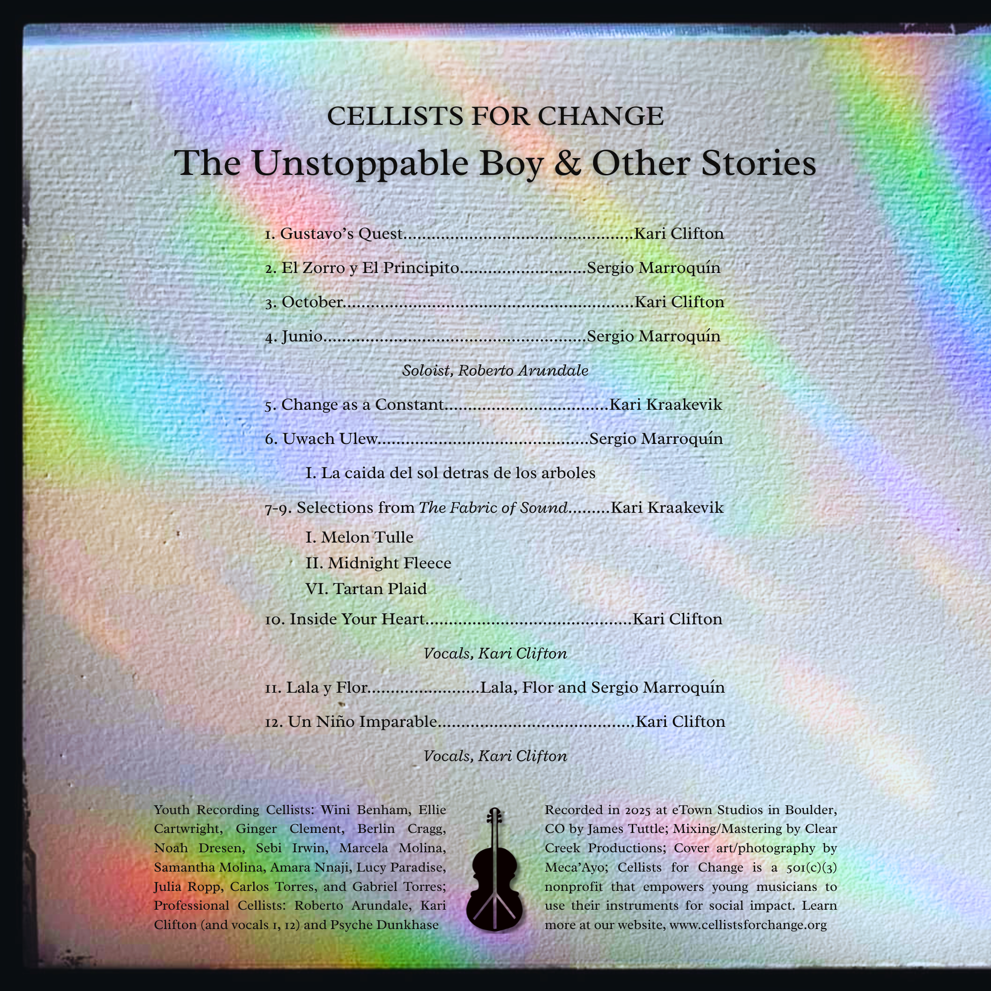 Nuestro concierto presentará 12 piezas originales escritas exclusivamente para nosotros por tres compositores increíbles: Kari Clifton, Kari Kraakevik y Sergio Marroquín. Cada pieza cuenta una historia de esperanza, amor, valentía y mucho más. Para nuestros estudiantes, este proyecto fue más que una grabación; fue un viaje de representación, mentoría y arte. Para nuestros oyentes, es una oportunidad de experimentar el nuevo sonido de la música clásica: uno que refleja la diversidad y la esperanza de nuestro mundo.